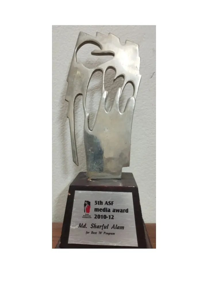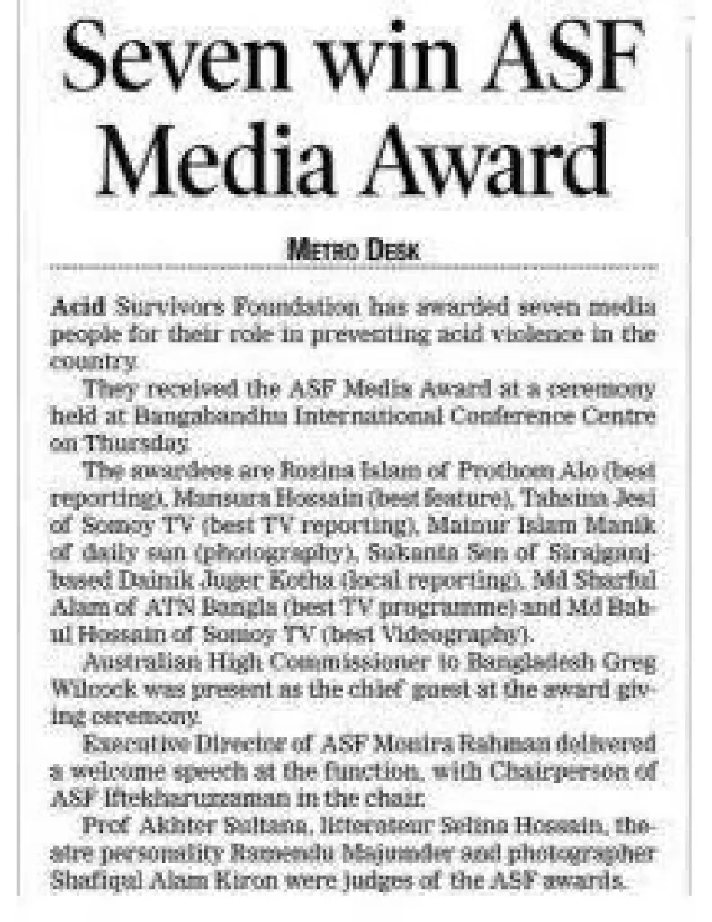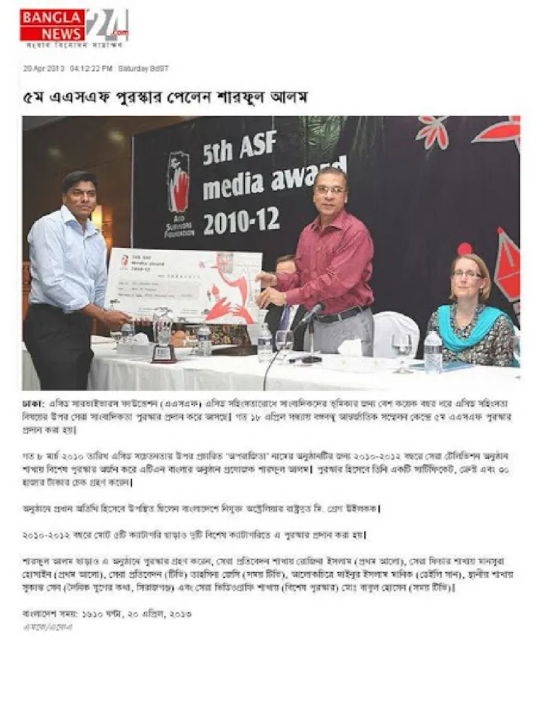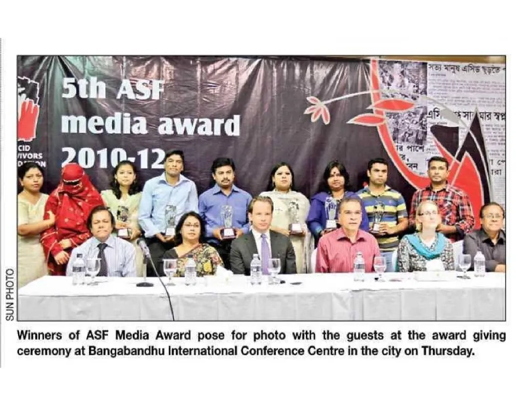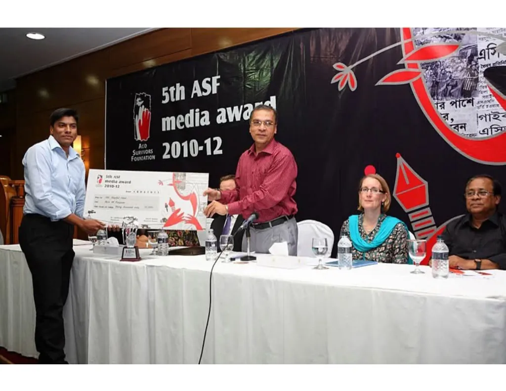 In 2013, I was honored to receive the ASF Media Award, one of Bangladesh’s most prestigious recognitions in the field of rights-based journalism. The Acid Survivors Foundation (ASF), in collaboration with its development partners, confers this award annually to celebrate outstanding contributions by journalists who help raise public awareness and drive policy change to prevent acid violence and promote gender justice across the country.