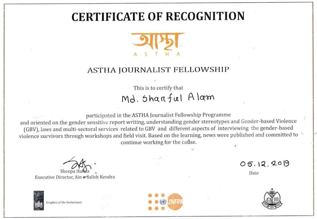 In recognition of my professional excellence and commitment to ethical journalism, I was awarded the ASTHA Journalist Fellowship on 5 December 2019, organized by Ain o Salish Kendra (ASK) in collaboration with the Kingdom of the Netherlands and the United Nations Population Fund (UNFPA). During the fellowship, I underwent extensive training on gender-sensitive reporting, with a focus on understanding gender stereotypes, gender-based violence (GBV), related legal and multi sectoral services. I was actively participated in workshops and field visits, gaining firsthand insights into the experiences of GBV survivors and applying this knowledge to produce impactful journalistic work. This fellowship stands as a testament of my dedication to promoting gender equality, human rights, and social justice through responsible and informed journalism.