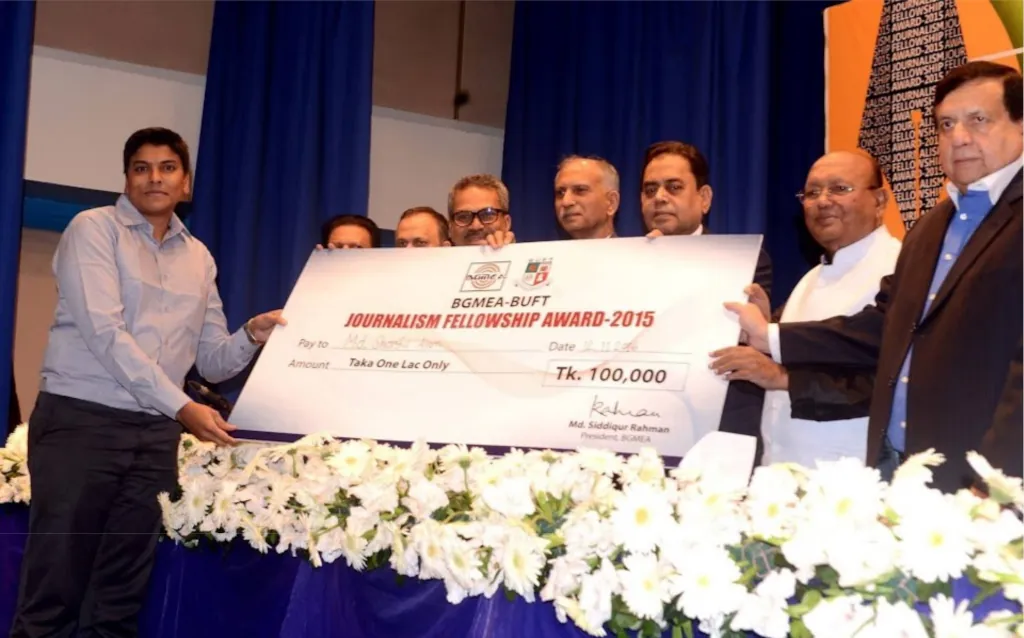 I won the BGMEA –buft journalism fellowship. Commerce Minister Tofail Ahmed handed over awards and cheques to the Fellows at a program held at Noorul Quader auditorium of BGMEA Complex on 12 November 2015. BGMEA President Md. Siddiqur Rahman chaired the fellowship award giving ceremony and announced the names of the Fellows selected by a three member Board of Mentors. The Fellows are Nasrin Huda Bithi, reporter of VOA, Ibrahim Hossain Ovi, staff reporter of the Dhaka Tribune, Md. Mizanur Rahman Chowdhury, senior staff reporter of the Daily Jugantor, Reyad Hossain, staff reporter of the Daily Ittefaq, Mehedy Hasan Albakar, staff reporter of ETV and Md. Sharful Alam, reporter of ATN Bangla. Dhaka University Vice Chancellor Prof. Dr. AAMS Arefin Siddique and BUFT Trustee Board Chairman Mozaffar Uddin Siddique attended the program as Special Guests. Three Mentors of the BGMEA-BUFT Journalism Fellowship are Editor-in-Chief of ETV Monjurul Ahsan Bulbul, Editor of the Daily Bhorer Kagoj Shyamal Dutta and Director News of Ekattor TV Syed Ishtiaque Reza were also present at the fellowship award giving ceremony.