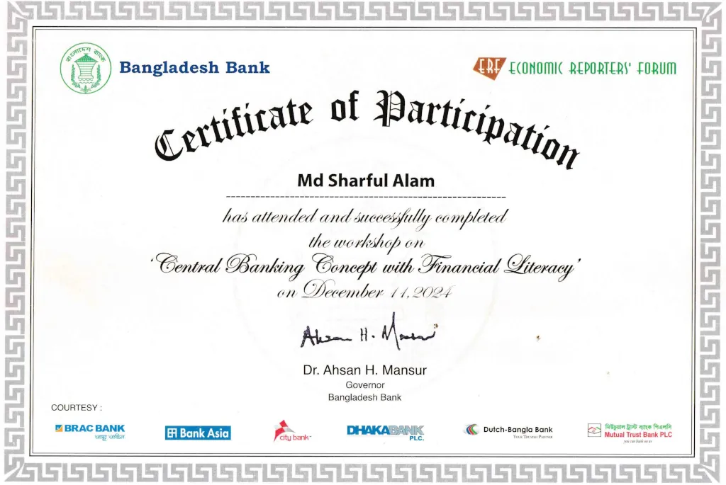 In December 2024, I am completed a specialized workshop titled Central Banking Concept with Financial Literacy, jointly organized by Bangladesh Bank, the country’s central financial regulatory authority and the Economic Reporter’s Forum (ERF). The program was supported by leading financial institutions including BRAC Bank, Bank Asia, City Bank, Dhaka Bank, Dutch-Bangla Bank and Mutual Trust Bank. This exclusive workshop was designed for selected financial journalists and media professionals to enhance understanding of monetary policy, financial system stability, and national financial literacy strategies.