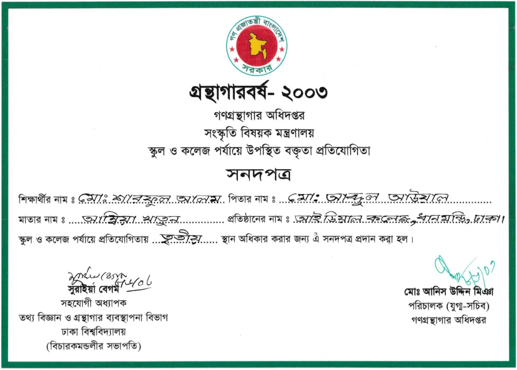 In 2003, I was honored to receive the official Certificate of Merit from the Government of the People’s Republic of Bangladesh, conferred through the Department of Public Libraries under the Ministry of Cultural Affairs. The recognition was part of the national initiative titled “Library Year 2003” a government program aimed at promoting education, reading habits, and intellectual development among students and young citizens across the country.