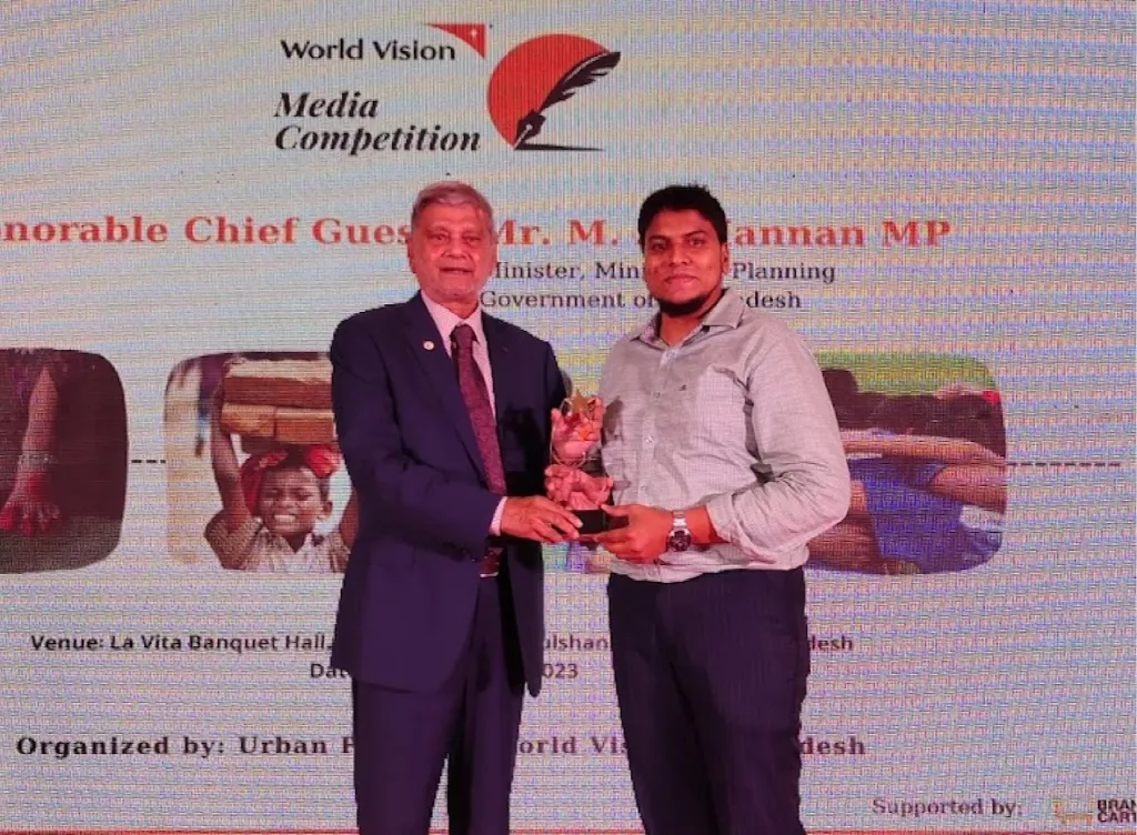 The competition was organized by World Vision Bangladesh with the aim of directing policymakers’ attention towards the steps taken to improve the living standards of low income urban populations, especially women and children, through media reporting. Participants prepared reports focusing on problems faced by city-dwellers and possible ways out. 2 September 2023, Dhaka, Bangladesh Award ceremony held at Lakeshore Hotel Gulshan. The cash prize, crest and certificate were handed over by M. A. Mannan, Planning Minister of Bangladesh during the award ceremony. Judging & Guests. The event featured key specialguests and a judging panel. Special guests included Emeritus Professor and former Bangladesh Bank governor Atiur Rahman, Additional Secretary and Director of the Hazardous Child Labour Elimination Project Md Monowar Hossain, Director General of the Press Information Bureau Zafar Wazed, and Deputy Secretary of the Ministry of Labour & Employment Mohammad Abdul Kader.