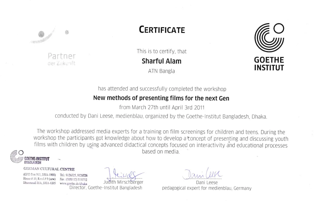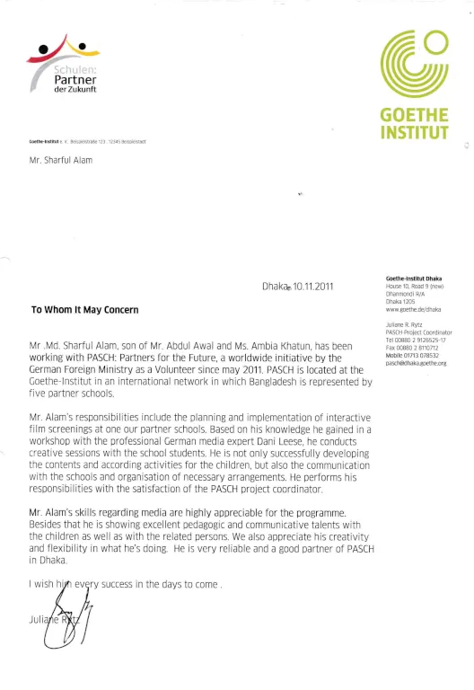 In 2011, I had the honor of serving as a Volunteer Media Coordinator under the PASCH Schools: Partners for the Future programme, a global initiative of the German Federal Foreign Office, implemented by the Goethe-Institut Dhaka. Since May 2011, I actively contributed to strengthening educational and cultural cooperation between Bangladesh and Germany.