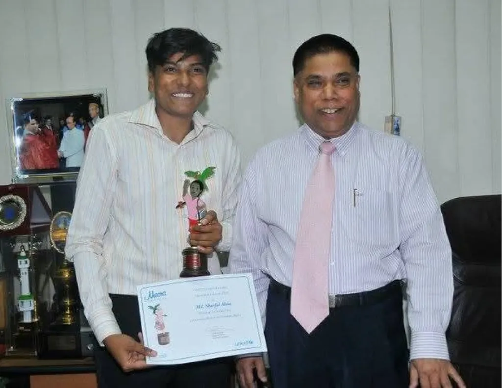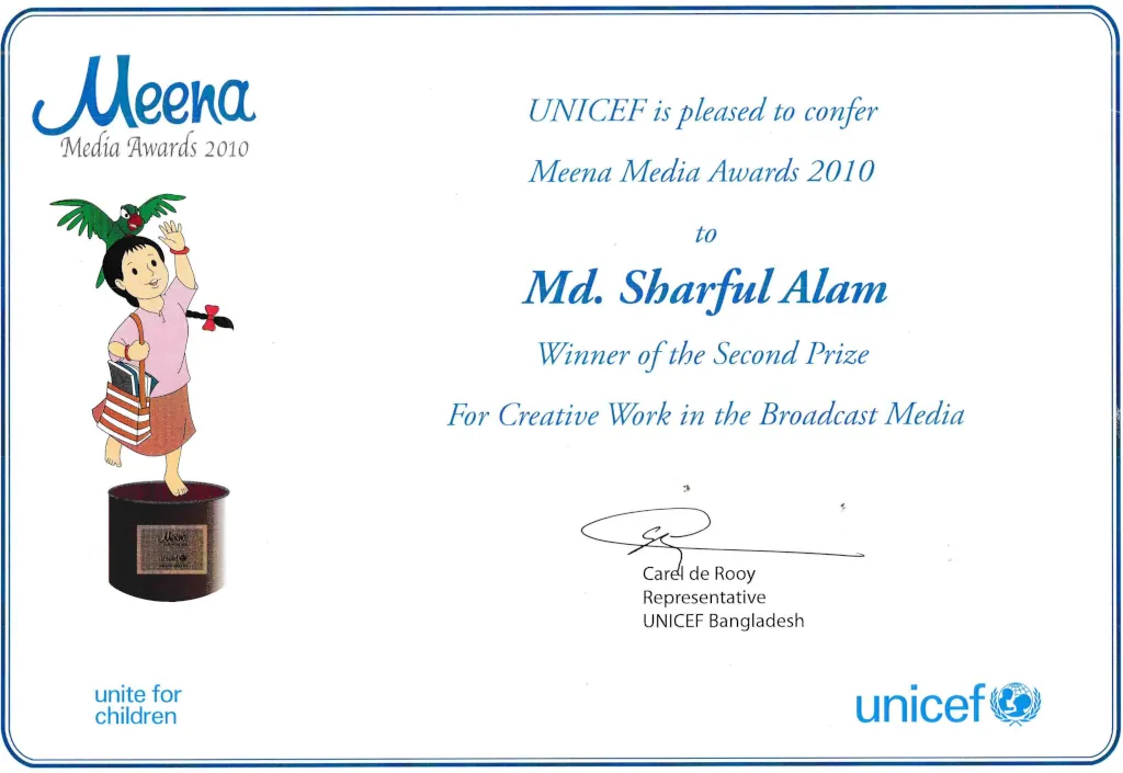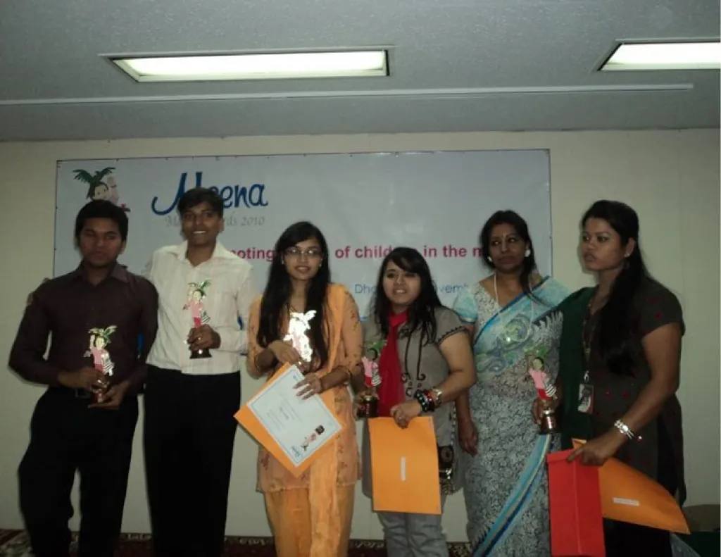 UNICEF Bangladesh introduced the Meena Media Awards in 2005 to promote child rights. The award is named after Meena, the popular child animation character who raised her voice on the rights of children. 28 November 2010, Unicef conferred the sixth annual Meena Media Awards 2010 to 21 journalists, documentary makers and writers for their outstanding work in promoting child rights. Award winners and nominees were selected from around 400 entries in two major categories: journalistic and creative, for both print and electronic media. UNICEF Representative Carel de Rooy handed over the crests and certificates to the winners in a award giving ceremony.