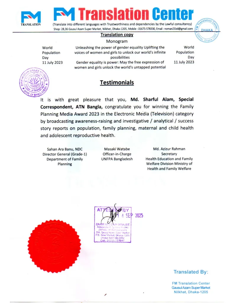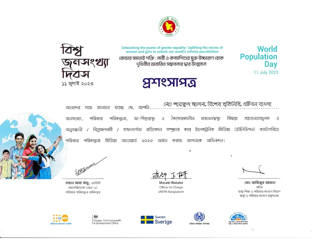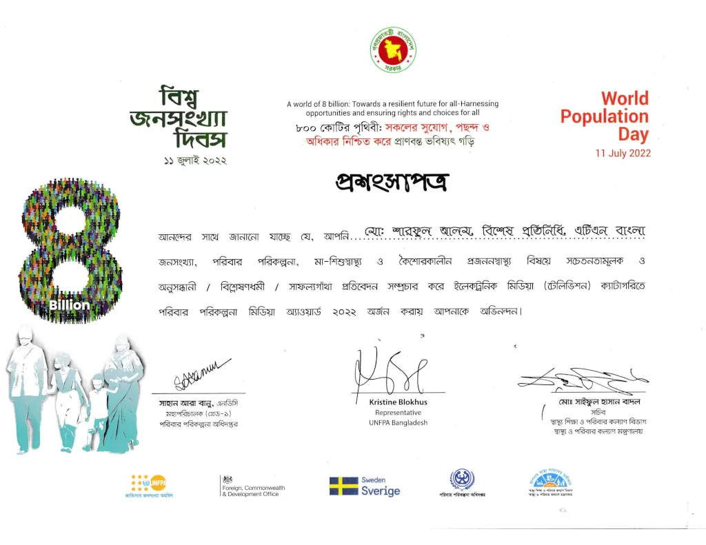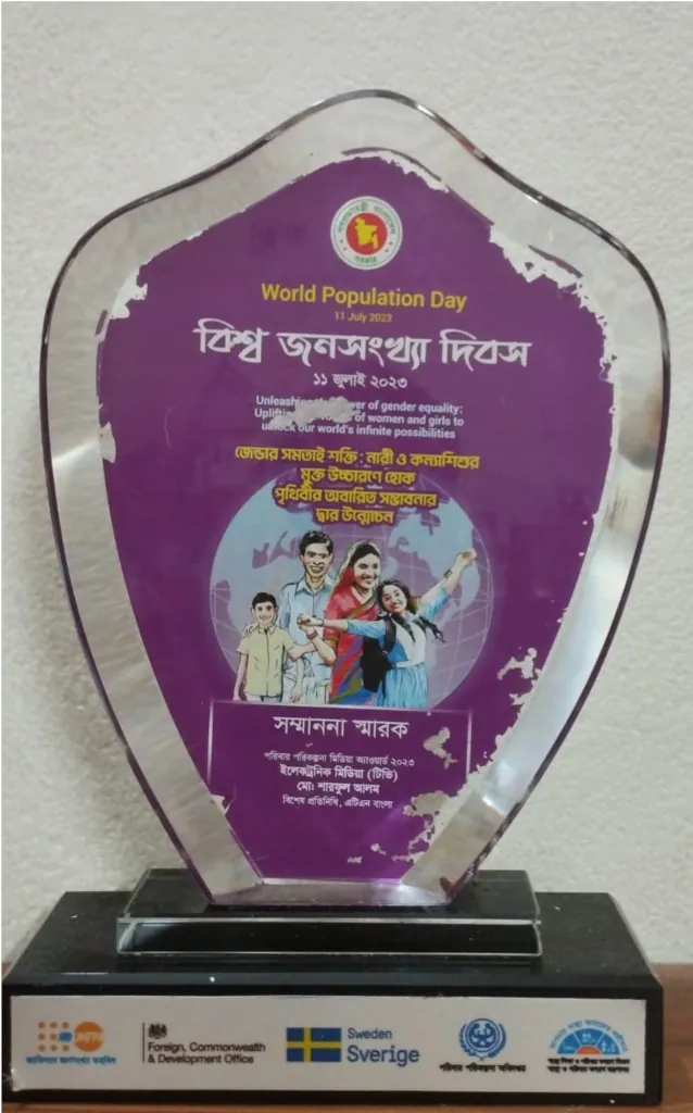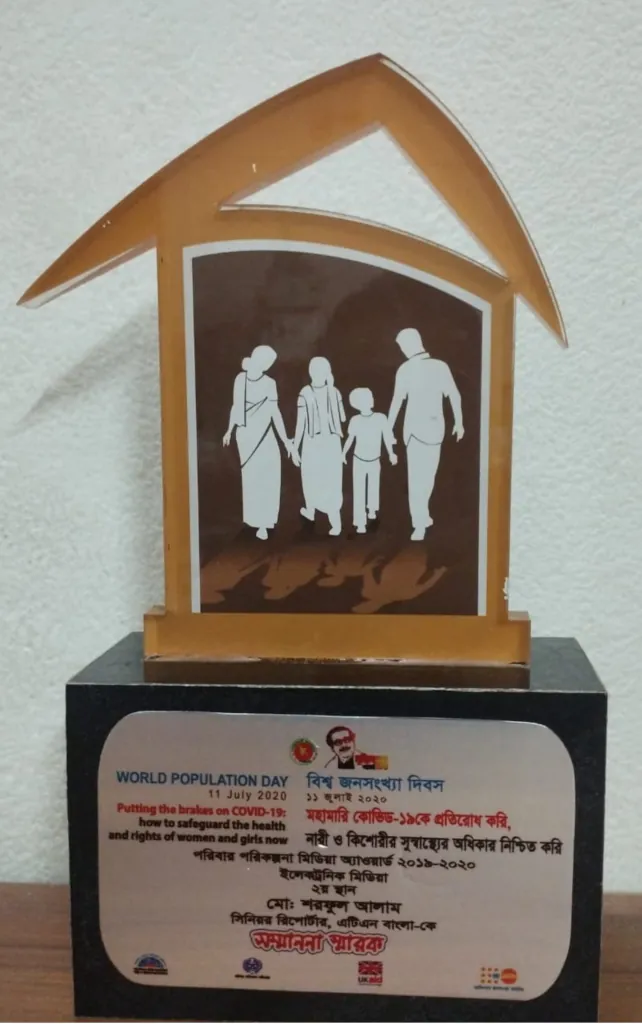 On 11 July 2020, I was formally recognised by the Directorate General of Family Planning (DGFP), under the Ministry of Health and Family Welfare of the Government of the People’s Republic of Bangladesh, for my work in journalism focusing on family planning, maternal and child health, and sexual and reproductive health and rights (SRHR) issues. The award was announced at the virtual programme for World Population Day 2020, which this year was held virtually in light of the COVID-19 pandemic.